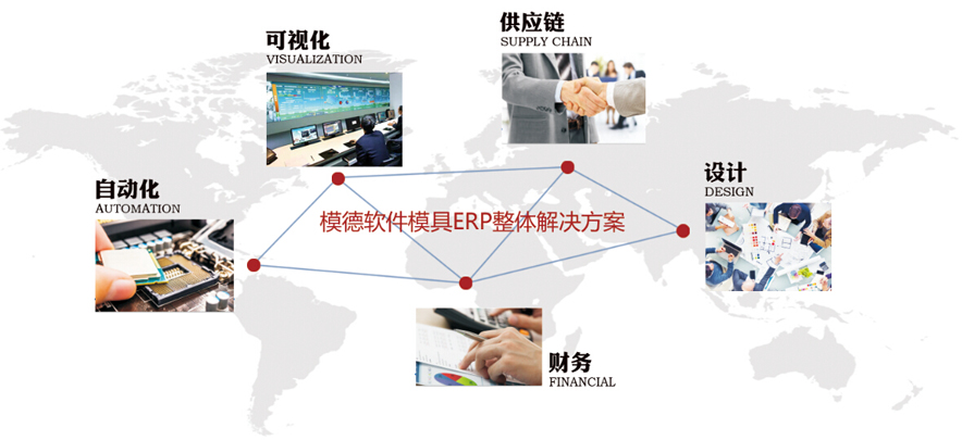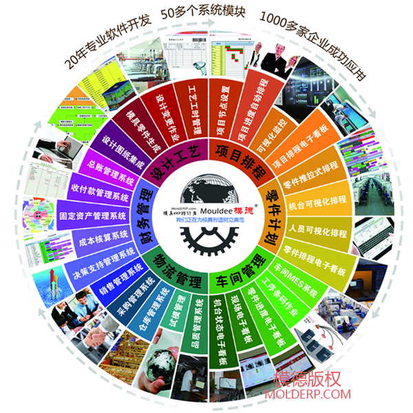 提高效率,提升品质,降低成本等,模具工厂所面临的各类庞杂课题,模德软件帮您一站式解决以MoldERP系统为首,助您全面掌握生产现场的各种状况,实时收集情报并进行可视化管理,确保工厂精益生产ERP、OA、CRM、PLM等先进的管理系统,为全面优化工厂提供整体解决方案实现工厂的效率化、提高工厂竞争力,有关工厂管理的任何问题,都放心的交给我们吧