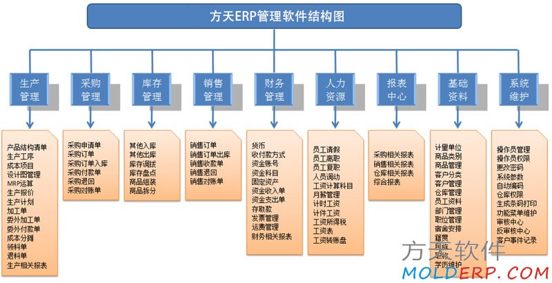 方天ERP 主要满足工厂各部门提出各项需求。系统主要依据工厂制造环境是动态的,多变的及多要求的而进行模块化分析规划。与此同时,它提供在今天具有重要意义的有助于取得成本,交货期及质量等竞争优势的计划模块。它提供通过系统调整而广泛的设定非常容易适合不同业务需求的功能,此时不需要改写源代码及进行用户化工作。系统包含有40个主要模块,每一个模块又分为几个不同的子模块。每一个子模块具有它自己的下来菜单及独立的处理与报表功能。