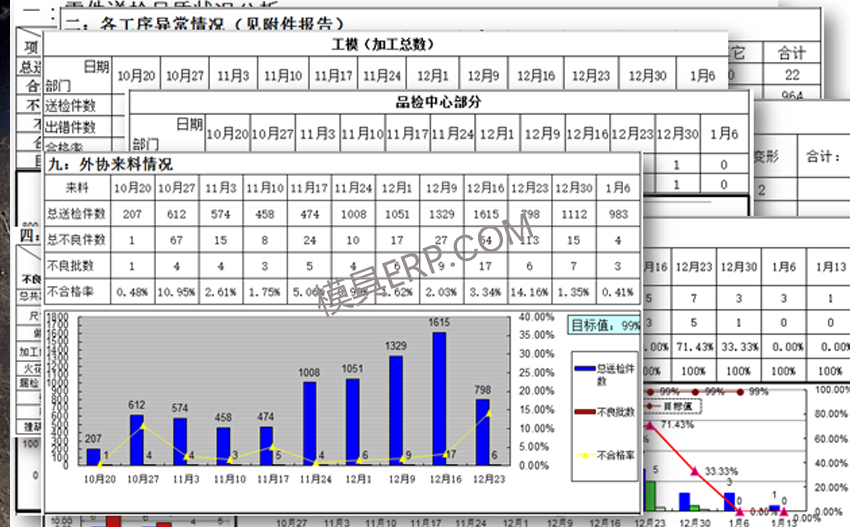 记录和统计模具生产过程各阶段的品质信息,包括采购物料入库检验、工序检验、试模报告、模具检验、成品检验等。