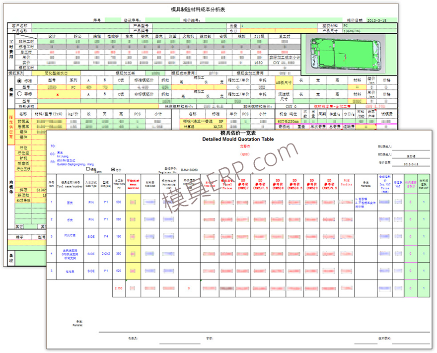 业务单位在客户要求报价时,如何针对客户所提供的样品或图纸进行成本分析与报价作业?模具分析过程一般会将公模、母模、轴心及其它零件的料、工、费逐一进行分析,然后加上一定的利润,以做为报价的基础。模具报价与接单单价未必相同,除此之外,模具在生产过程中实际生产成本如何实时监控?各零件用料成本与工时成本是否超标?哪些工序当初报价偏低?模具反复试模、维修等导致试模及维护成本统计困难。