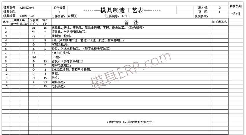 制定每套模具加工零件详细的加工件数,工作中心,加工路线,担当者,加工工序开始时间和计划结束时间,作业说明等加工信息。