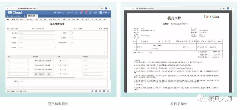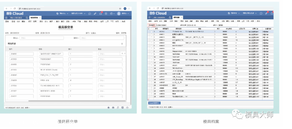 建立模具档案,计算模具寿命,实时查询模具履历。对模具购置、入账、贴标、日常使用、盘点以及清理进行全生命周期管理。模具MLM系统与方天ERP系统分开管理,同时又数据联动,保证财卡物的一致性。